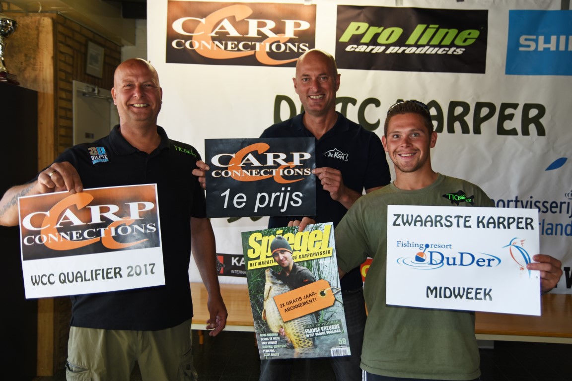 John Hendriks en Ricardo Eerland met hun eerste prijs (ticket voor de WCC Qualifier), de prijs voor de zwaarste vis (midweek Fishing resort Du Der) én een jaarabonnement op Spiegel Magazine.