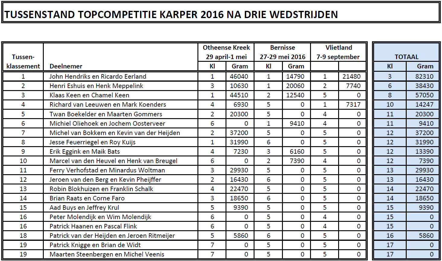 Op zaterdagochtend ving het koppel Hendriks & Eerland hun tweede vis, waarmee ze hun positie als koploper verder veilig stelden. Omdat er zaterdag en zondag verder geen karpers meer zijn gevangen, werden ze zondagochtend uitgeroepen als winnaar van de wedstrijd. Een knappe prestatie, vooral omdat dit de derde wedstrijd op rij is waarop het koppel de eerste plaats in hun sector behaalt.
