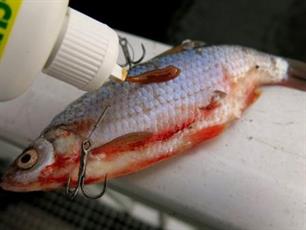 De bedoeling van de Super Gel is om de snoek eerder op je dode aasvis te attenderen – en uiteraard ook ondubbelzinnig toe te laten happen. Want geeft zeevis als sardine en horsmakreel nog wel wat geur en olie af; een dooie blankvoorn in ‘naturel-vorm’ mag voor het mooie eigenlijk nog wel wat meer stinken. Deze geur-theorie wordt extra kracht bijgezet door het verhaal over een jeugdige snoekvisser die de ene na de andere snoek vangt aan een ‘statisch’ op de bodem aangeboden en in visolie geweekte shad. Een ‘dode’ shad dus. Hier zit duidelijk een geurtje aan…