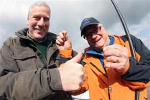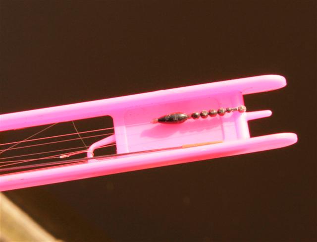 We proberen eerst een paar voorntjes te vangen en dan is het goed als het aas een beetje natuurlijk beweegt. Je plaatst het bulklood ( zo noem je het lood als het gegroepeerd is) zo'n 50 cm van de haak en een klein loodhageltje op circa 25 cm vanaf de haak. Heb je het op brasem gemunt, dan schuif je het bulklood naar beneden tot zo'n 30 cm vanaf de haak. Het aas ligt dan een stuk op de bodem, gedraagt zich veel passiever, en daar houdt brasem van.