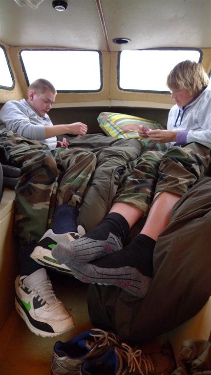 Dat is wel even wat anders dan een winderige bivvy. In de kajuit leggen Nick en Jens een kaartje terwijl ze samen met hun karperhengels geduldig wachten op een volgende aanbeet.