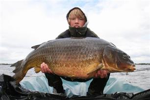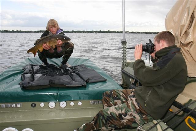 Het voordek van de open drilboot  is feitelijk één grote onthaakmat: het gladde en achte zeil vormt de ideale landingsbaan voor de schitterende karpers die hier zwemmen.