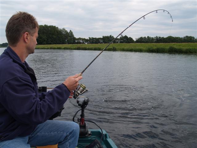 Eddy drilt een grote roofblei die hij al slepend wist te haken. Hij gebruikt bij het vissen op roofblei bij voorkeur een relatief parabolische hengel die de haak in de zachte bek niet te veel belast.