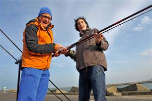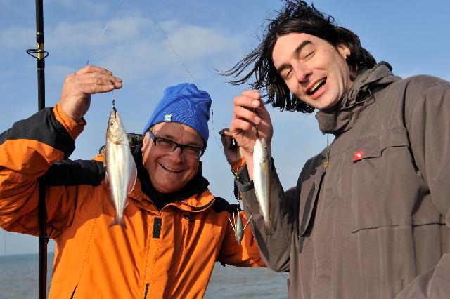 Omdat de vis ver uit de kant aast en er nog een vis tussen de stenen wordt verspeeld, moet Rudy toch even een hengel van Ed lenen om een visje te kunnen vangen. "Dat erfstuk is mooi, maar ik ga toch een moderne strandhengel aanschaffen!"