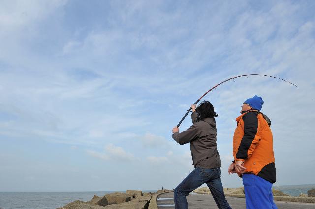 De oude glasvezelhengel moet het in strakheid uiteraard afleggen tegen de moderne werpkanonnen, maar er valt niet al te ver van de pier nog best mee te vissen.