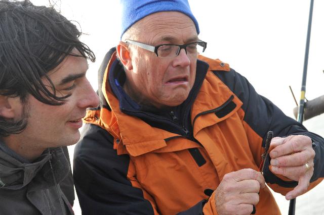 Ed laat zien hoe je met de aasnaald een zeepier op de haak schuift en daarna kan Rudy helemaal los.