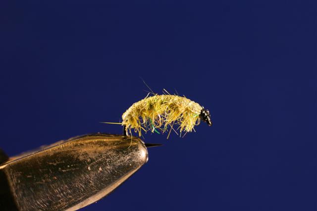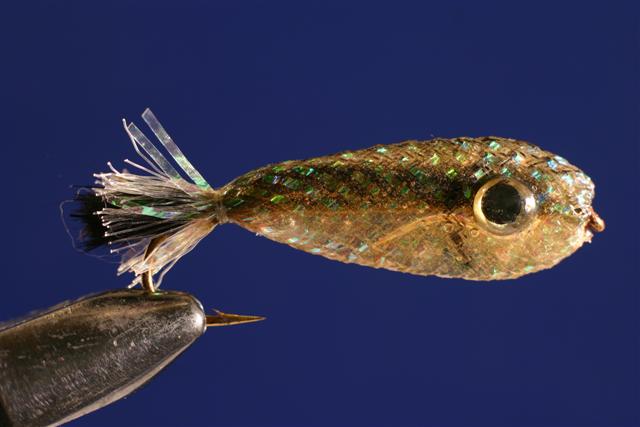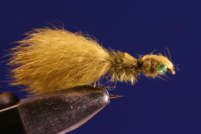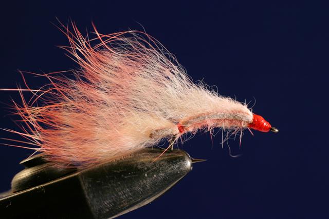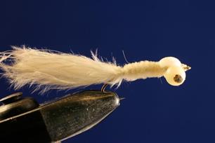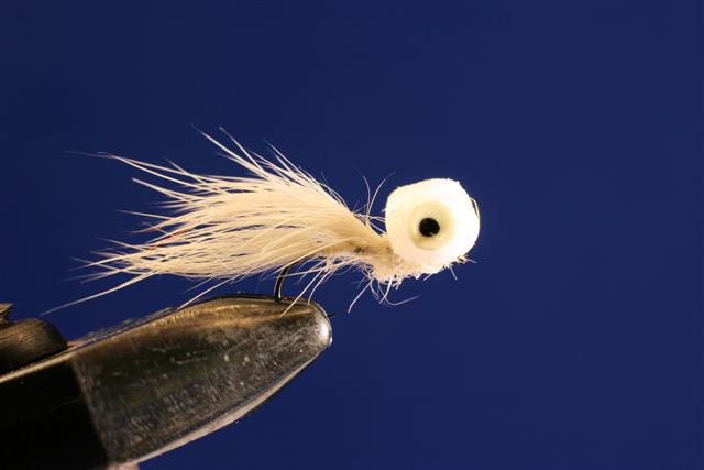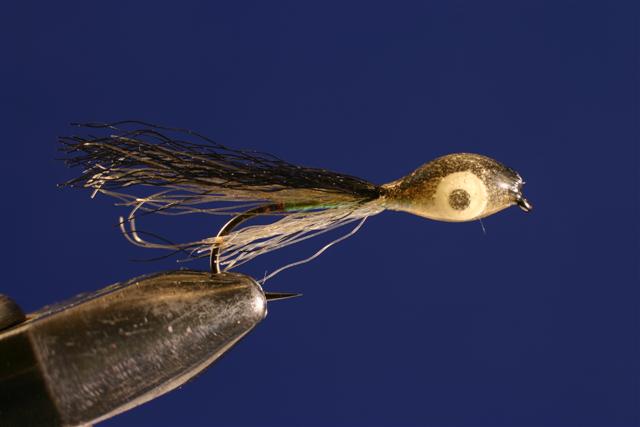 Haak 10. Deze vlieg dank zijn naam aan de fluoriserende kraalogen die met een zaklampje moeten worden ingestraald. Deze vlieg vis ik bij voorkeur in de schemering en donker met een intermediate glaslijn en langzame halen.