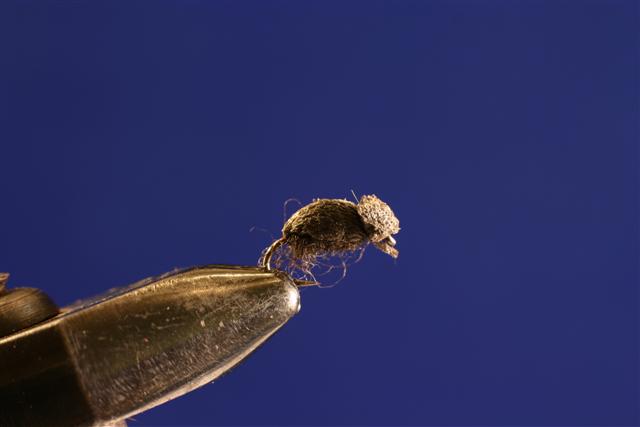 Haak 14. Met deze vlieg ving ik mijn grootste forellen: 71 centimeter vrouwtje en 65 centimeter mannetje. Ook deze vlieg wordt aan een drijvende gevette leader met een puntdikte van 22/00 gevist, maar bij een aanbeet moet er niet worden geslagen. De vis haakt zichzelf.