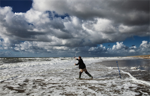 De westenwind van ruim kracht vijf blaast recht in ons gezicht zodra we het duinpad oversteken. In onze ogen priemt de felle zon. Eenmaal op het strand is het uitzicht een traktatie: de ruige zee steekt scherp af tegen donkere wolkenpartijen, in de verte trekt een bui over het strand. Kai stapt stevig door, de voorbij zoevende zandkorrels en plukken schuim negerend. Voor hem is dit beeld niet uitzonderlijk en met het terrein is hij vertrouwd. Al acht jaar lang vist hij elke week wel twee à drie keer aan de Noord-Hollandse kust tussen IJmuiden en Den Helder. Vooral de ‘Schagense stranden’ – van Petten tot Groote Keeten – kent hij als zijn broekzak. Kai is geboren en getogen in de kop van Noord-Holland. Zijn vader en zijn opa waren ook strandvissers, minstens zo fanatiek als hij.