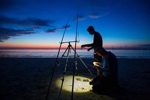 Erik Brandwijk (44) uit Papendrecht is zeevisser in hart en nieren. Zijn zoon Sander (14) is inmiddels ook in de ban van het strandvissen, en de haaivisserij in het bijzonder. Stapje voor stapje brengt pa hem daarom de fijne kneepjes bij. Hét VISblad schoof aan bij een vrijdagavondsessie op het Banjaardstrand.