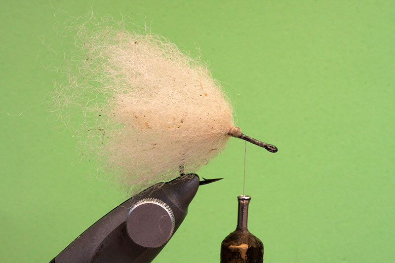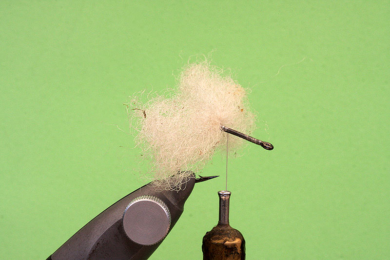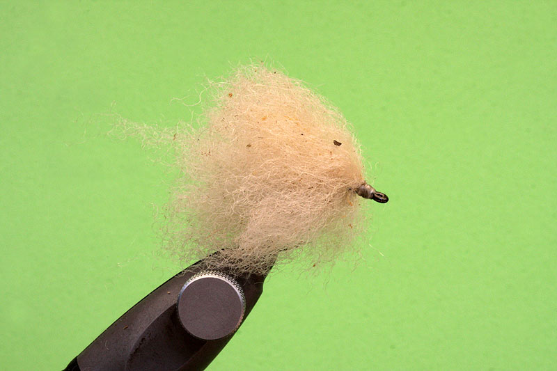 Daarna bind ik een toefje schapenwol in op de haakbocht. Deze wol is wat stug en vettig, zodat hij net drijft of langzaam zinkt. Kun je niet aan schapenwol komen, dan kun je ook Glowbug yarn (waar zalmeitjes van worden gebonden) gebruiken.