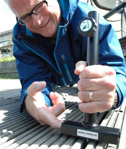 De Vlonderfix ziet er uit als een doorsnee hengelsteunhouder, zij het dat hij een beetje een apart ‘voetje’ heeft. Daarin schuilt de toegevoegde waarde van dit nieuwe product. Aan de onderkant zit een vernuftig draaimechanisme waarmee je het geheel stevig tussen de steigerplanken vast zet. In de Vlonderfix zit een buis waar je vervolgens de hengelsteun in kunt laten zakken. Met de draaiknop aan de zijkant fixeer je de steun en staat alles zo vast als een huis. Dit klinkt ontzettend handig en doordacht, maar we testen aan de waterkant natuurlijk wel even of het in de praktijk ook echt allemaal werkt. Daarom droppen we Ed Stoop met de Vlonderfix op een schitterende vissteiger pal voor een serviceflat in hartje Naaldwijk.