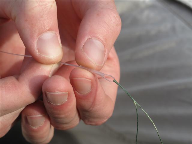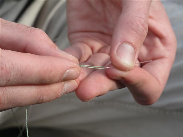 We zijn geen sloddervossen, dus even netjes de uiteindes afknippen. Let daarbij goed op dat je niet 'het verkeerde' uiteinde afknipt, namelijk de hoofdlijn of voorslag zélf! Dan kun je namelijk weer opnieuw beginnen en gesproken uit ervaring van de redactie is dat buitengewoon jammerlijk.
