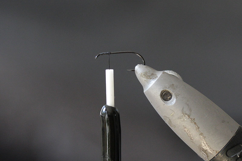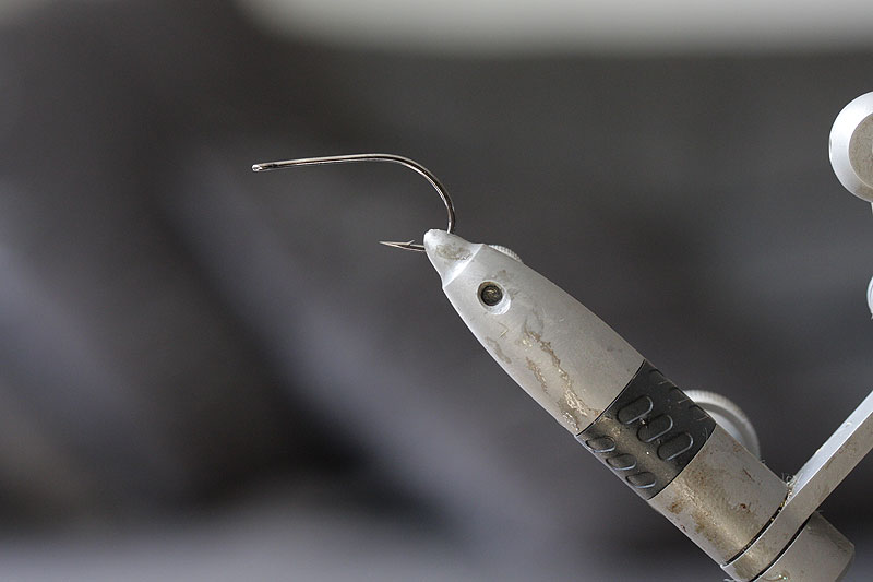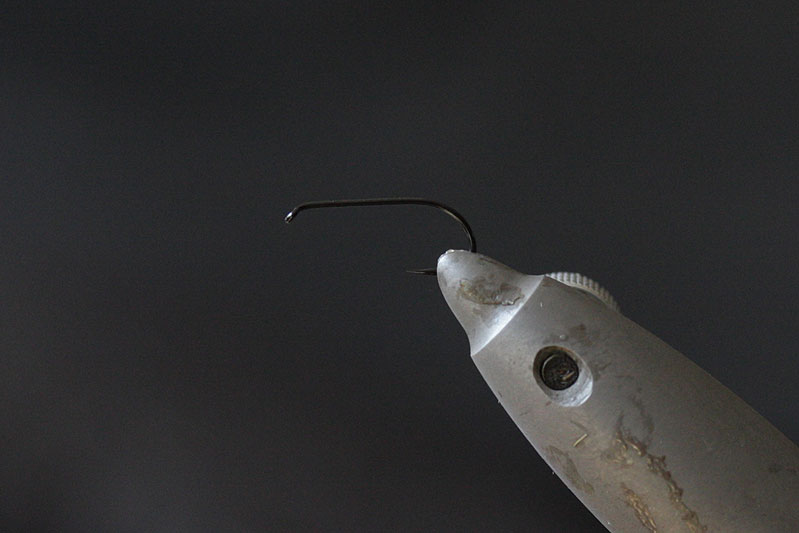 1. Zet een haak om droge vliegen op te binden, bijvoorbeeld TMC 102y, in de vice.