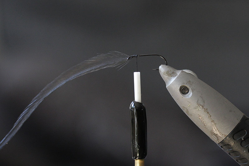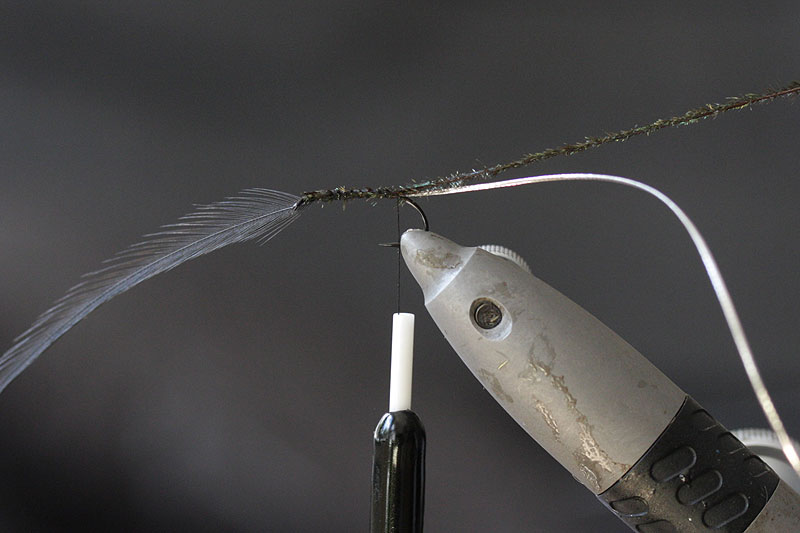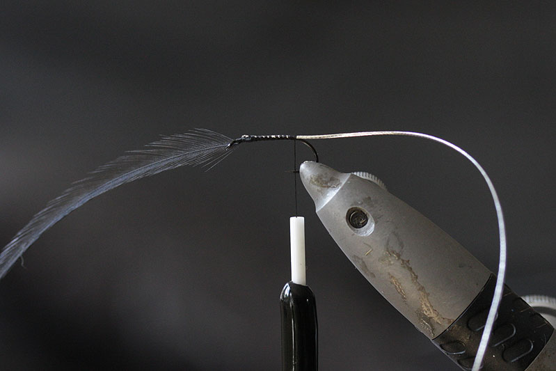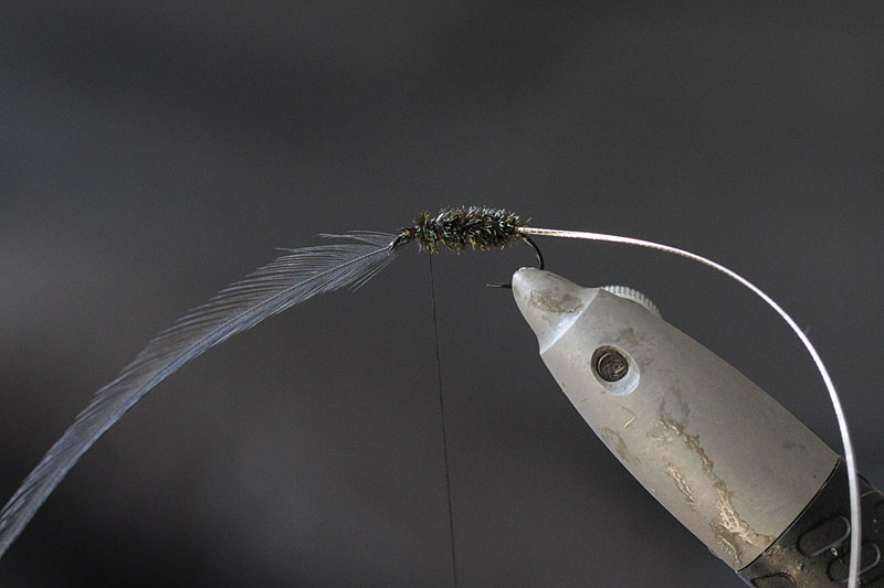 7. Wikkel de haneveer van voor naar achteren over het pauwfiber lijfje.
