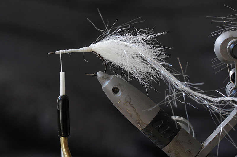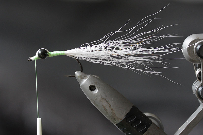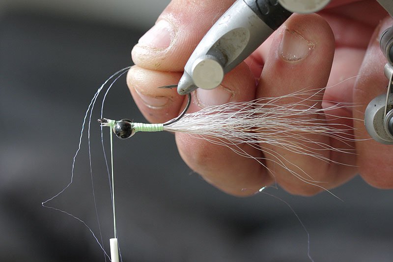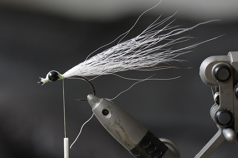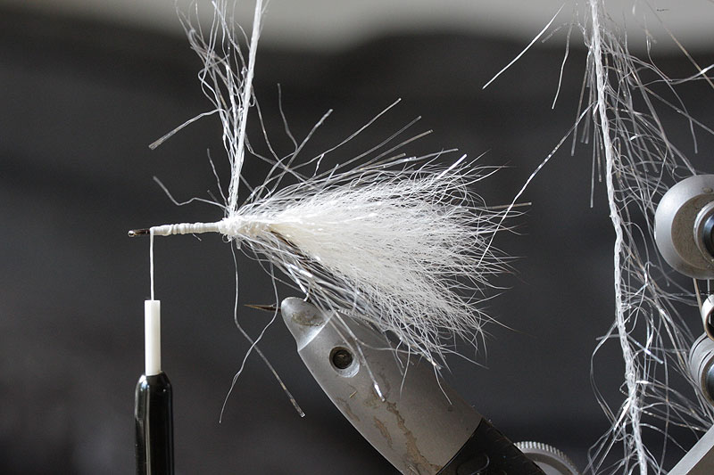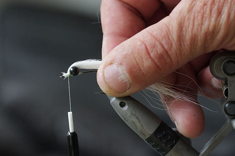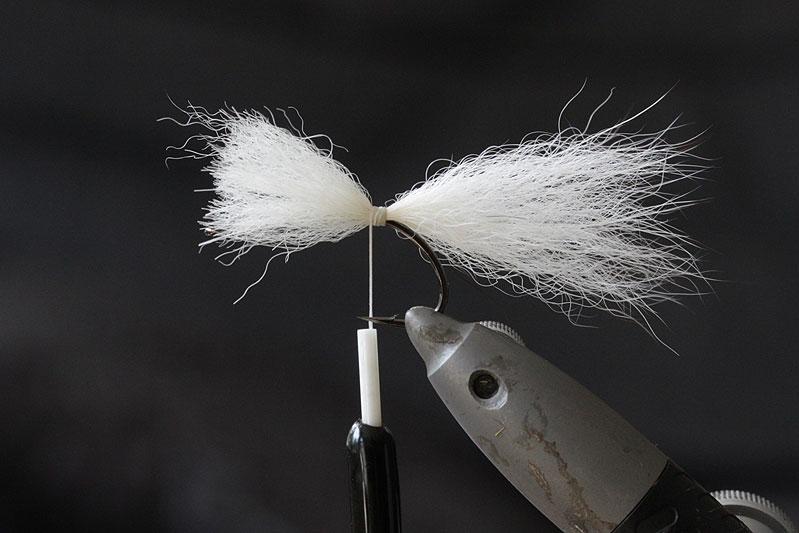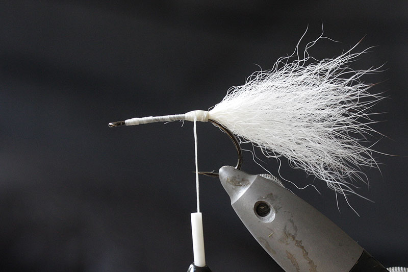 5. Bind een bosje wiite bucktail in bij het haakoog.