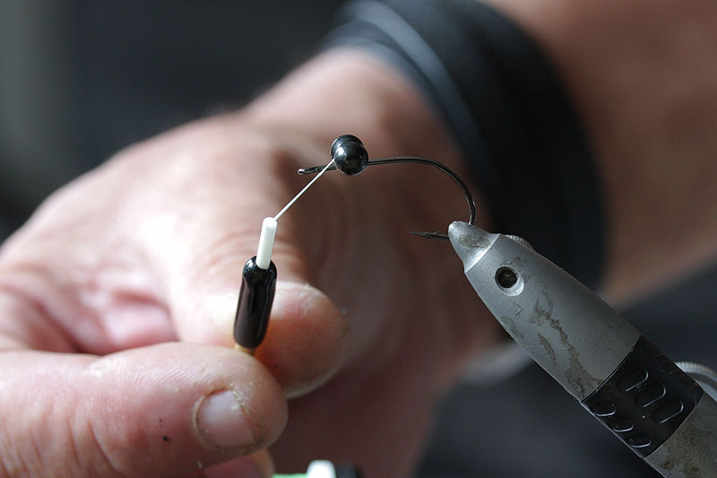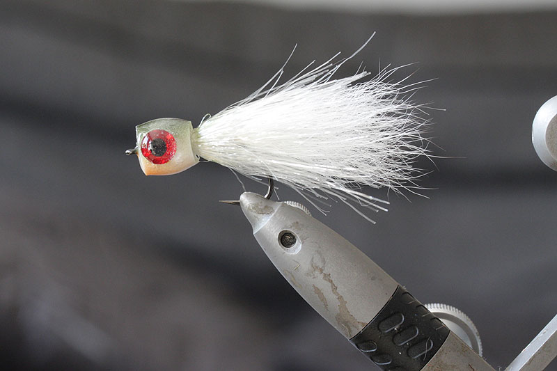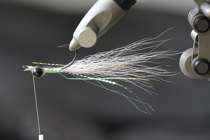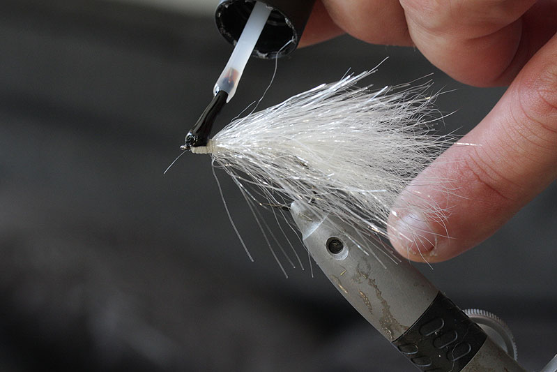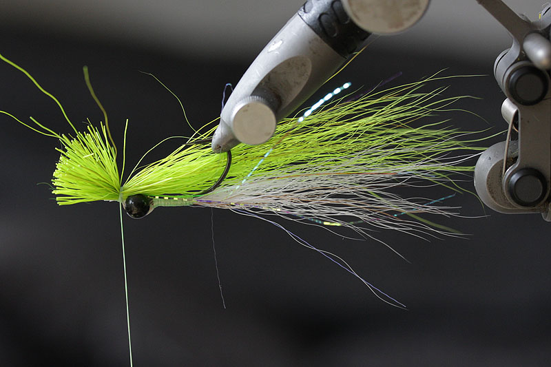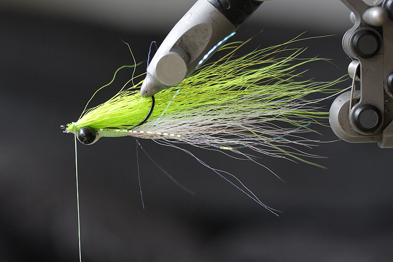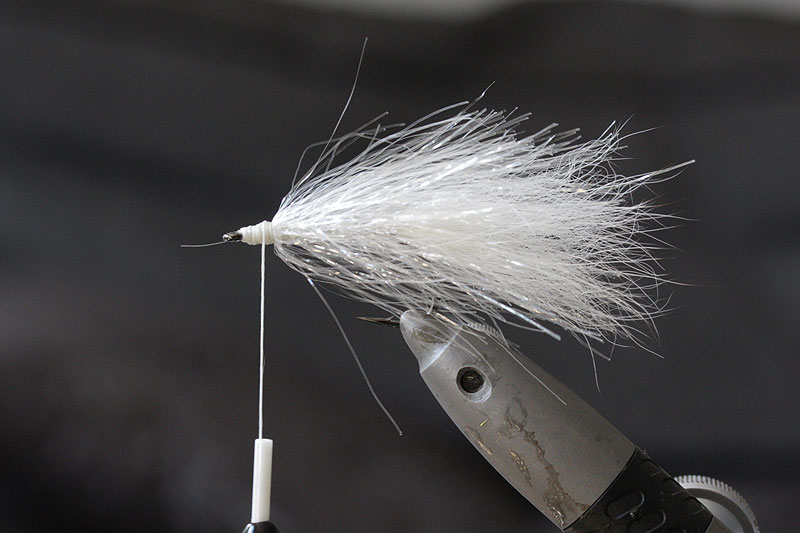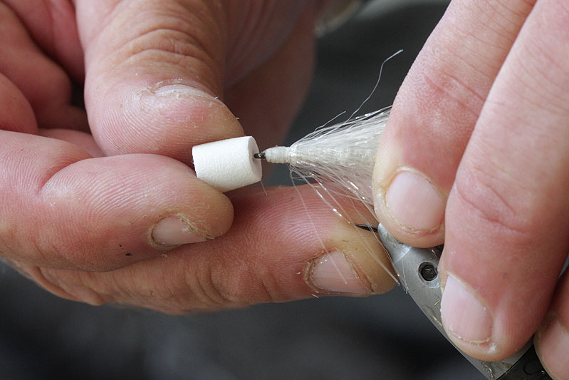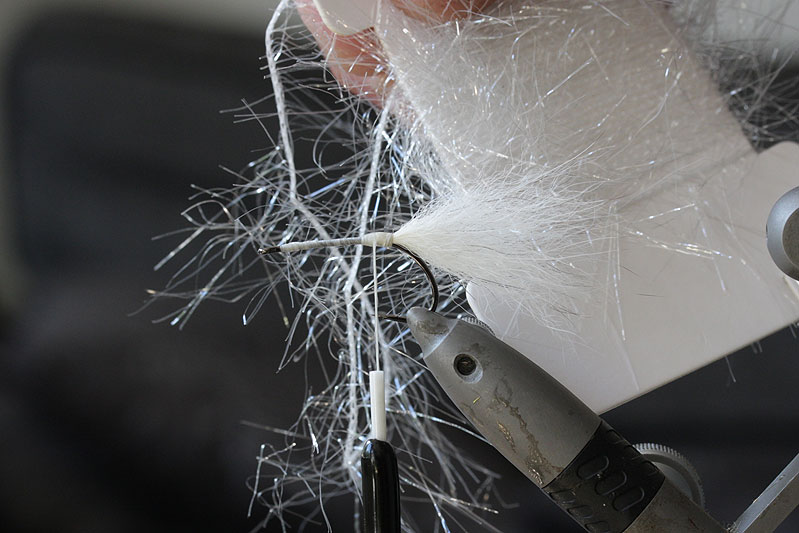 5. Bind een bosje wiite bucktail in bij het haakoog.
