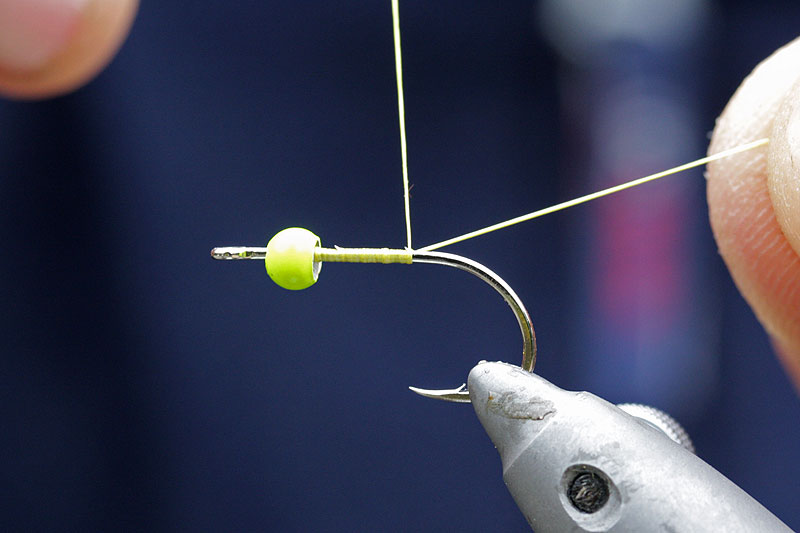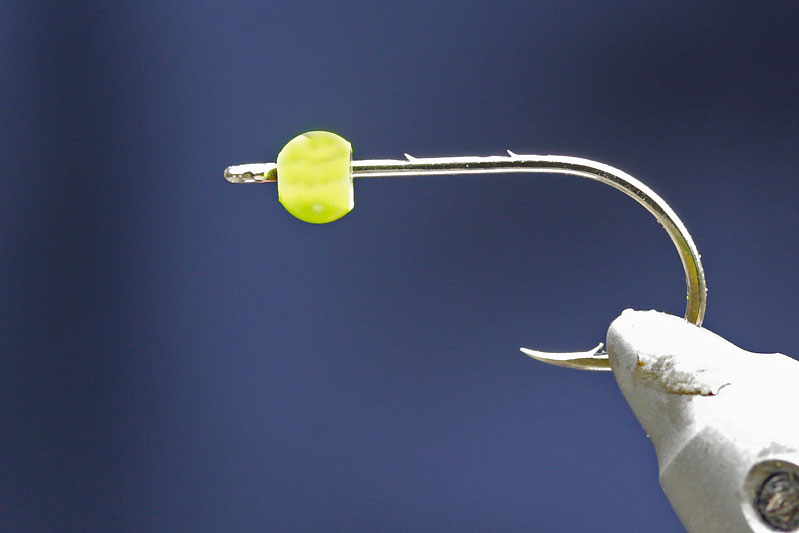 1. Zet een Gamakatsu LS-5213N haak voorzien van een gele kraal in de vice.