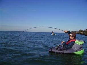 De Blokkendam op de Maasvlakte is één van de bekendere zeebaarsstekken onder (vlieg)vissers: tussen de blokken door staat vaak een flinke stroming die kleine prooivis in de problemen brengt en aan de binnenkant kun je prima vissen met de bellyboat. Aan de buitenkant vis ik in principe niet uit veiligheidsoverwegingen – alleen bij extreem rustig weer, weinig stroming, met reddingsvest en in gezelschap van een vismaat waag ik me daar.