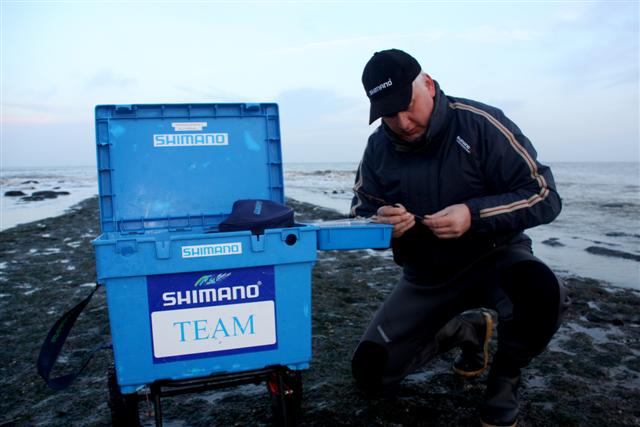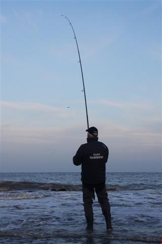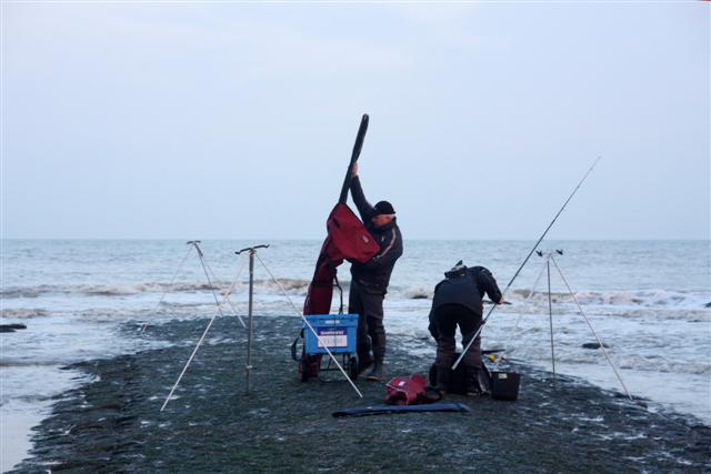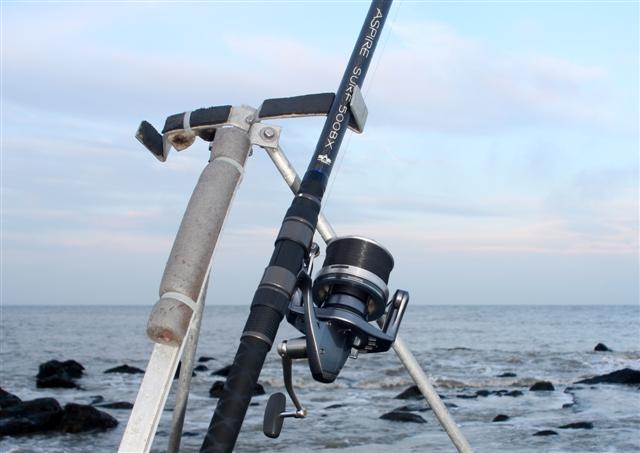 Een lange hengel van 4,5 of 5 meter is noodzakelijk om de vis vlotjes over de stenen glooing te kunnen manouevreren. De Shimano Aspire 500BX is zo'n hengel. In combinatie met een stevige zeemolen met grote spoel en dunne nylon hoofdlijn werp je het aas flink ver. Honderd meter mag geen probleem zijn. Extra tip: zet met twee tierips een stuk isolatiemateriaal op je driepoot. Hierin prik je de aasnaald zodat deze niet kwijt raakt.