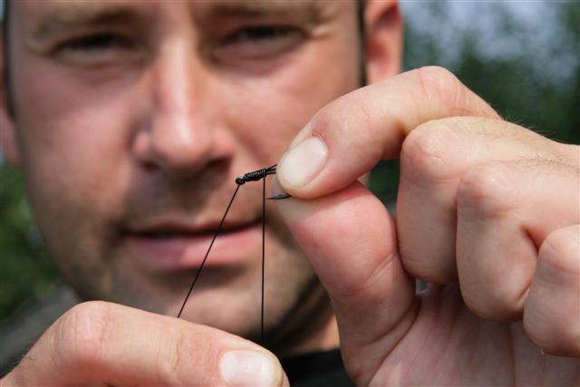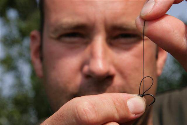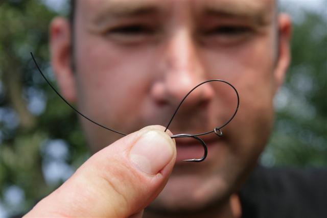 Haal het uiteinde van de lijn nu door de lus en bevochtig de knoop met wat speeksel. Je kunt het geheel nu langzaam maar stevig aantrekken.