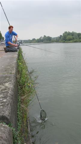 In een grote rivier als de Rijn mag het lokvoer zwaar en vooral rijk aan aas zijn. Wees dus niet te zuinig met het door je grondvoer mixen van bijvoorbeeld maden, mestpiertjes en zoete maïs. Let er bij het voeren wel op dat je de voerplek zo klein mogelijk houdt. Dan hoeft de vis niet lang te zoeken naar je haakaas.