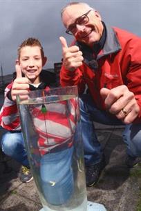 Op het moment dat ik bij de haven achter het Gemeentehuis van Zeewolde arriveer, is Kay al druk in de weer met een tuigje waarop hij een hele rits loodjes aan het vastzetten is. Eerst de hele kleintjes en vervolgens richting het haakje een stel grotere loodhagels. Het ziet er hartstikke mooi uit en ik maak hem dan ook complimenten voor zijn voorwerk. Jammer genoeg is al dat werk echter voor niets geweest, want zo lood je een pen namelijk niet uit.