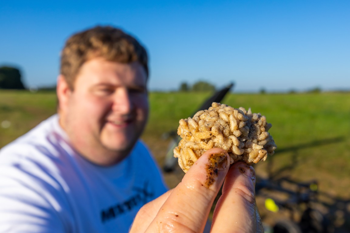 Veel feedervissers vullen de korf bij het vissen op de grote rivieren vaak niet met maden – die spoelen door de sterke stroming immers snel (ver) weg. Geplakte maden bieden uitkomst om óp je stek een aantrekkelijk voerspoor te creëren. Aan de Gelderse IJssel laat Juul Slabbers (27) zien hoe dat werkt.