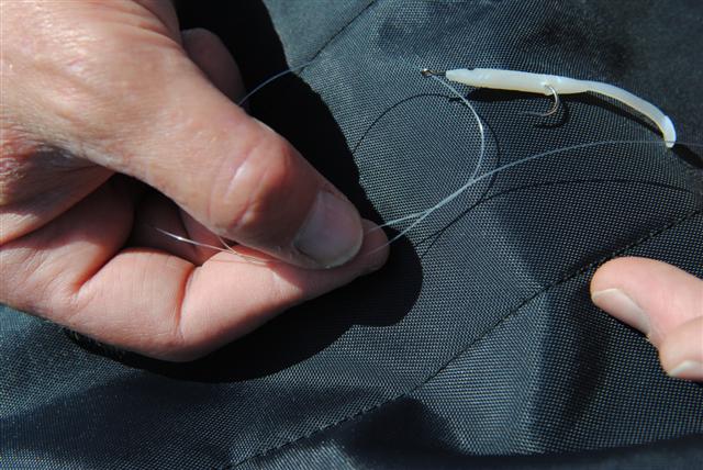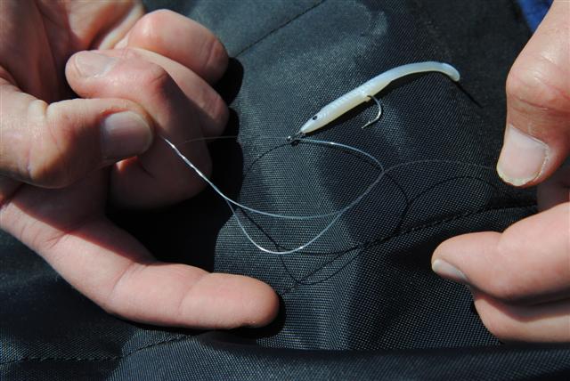 Neem een stuk fluorocarbon van 50-100 cm als onderlijn en leg in het midden een lus waarin je het deltavisje hangt. Neem overigens een onderlijn met een lagere trekkracht dan je hoofdlijn, zo voorkom je dat je relatief dure hoofdlijn verspeelt als je onverhoopt vast komt te zitten.