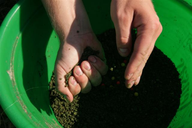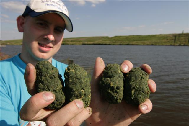 Voorvoeren is bij veel witvissers niet bepaald dagelijkse kost. Het loont echter wel om één of meerdere dagen van tevoren een voerplek op te bouwen. Brasems zijn namelijk gemakszuchtige gewoontedieren - net als de mens overigens - die graag bij een gedekte tafel aanschuiven. Gerben kiest voor een mix van 50 procent Betadine Green grondvoer van en 50 procent 4 millimeter pellets, beide van Ringer Baits. Maak deze mix zo nat dat je er stevige ballen van kunt kneden.