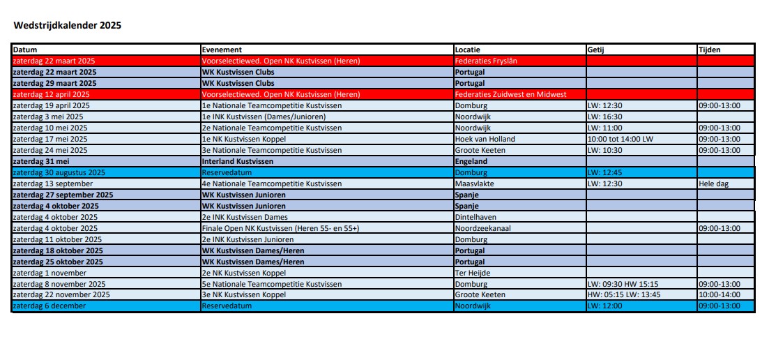 Sportvisserij Nederland organiseert in 2025 een aantal wedstrijden aan de Nederlandse kust. Daar kan iedereen aan meedoen. Dat kan als individuele visser, maar je kunt je ook als duo of als team aanmelden! Er zijn verschillende wedstrijden en competities, voor ieder wat wils!