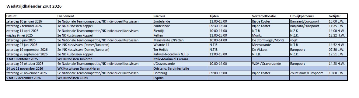 Nieuw in 2026 is dat we de Nationale Teamcompetitie combineren met het Nederlands Kampioenschap Kustvissen. Dit betekent dat je als individuele visser ook mee kan doen met het koningsnummer. Als individuele vissers strijdt je voor dagprijzen en de titel ‘Nederlands Kampioen Kustvissen Individueel’. Meer informatie vind je op de pagina van deze competitie.
